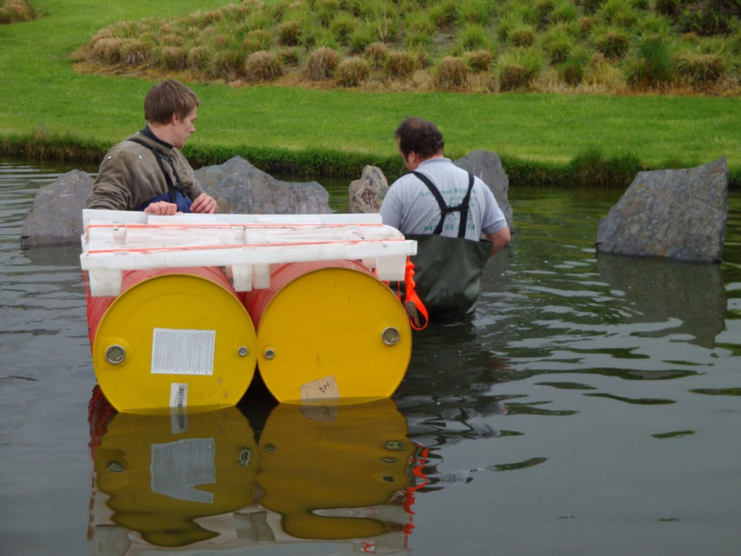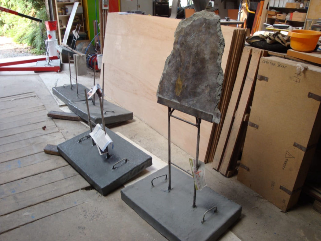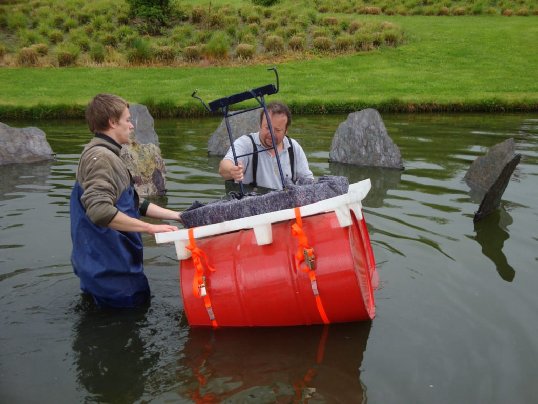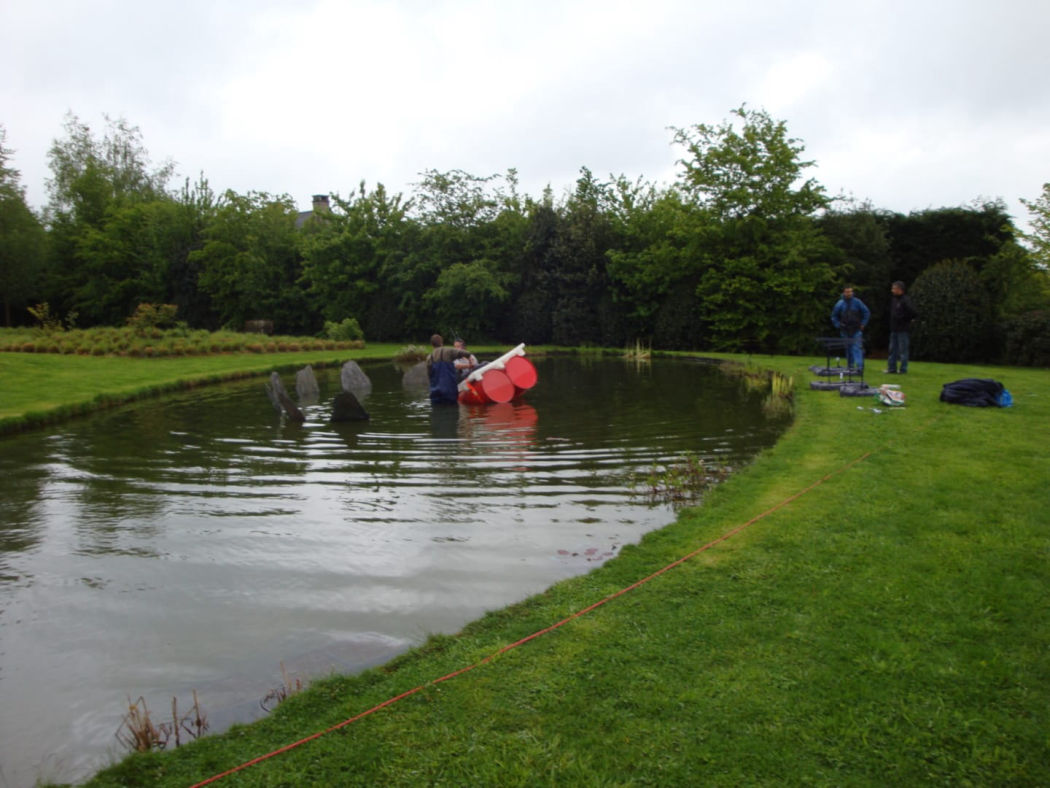 Intégration d’une installation sculpturale en schiste dans un étang dans un domaine privé