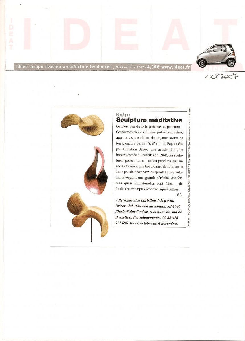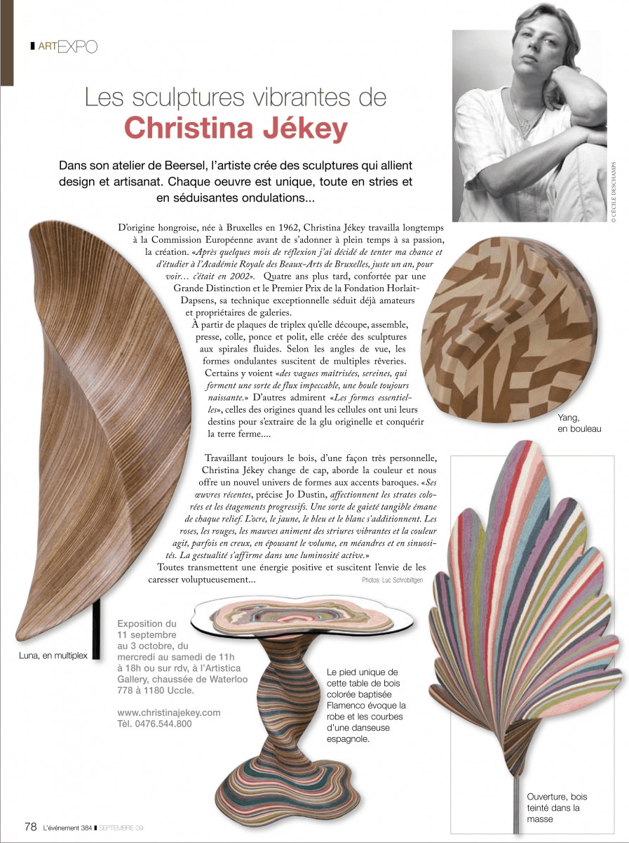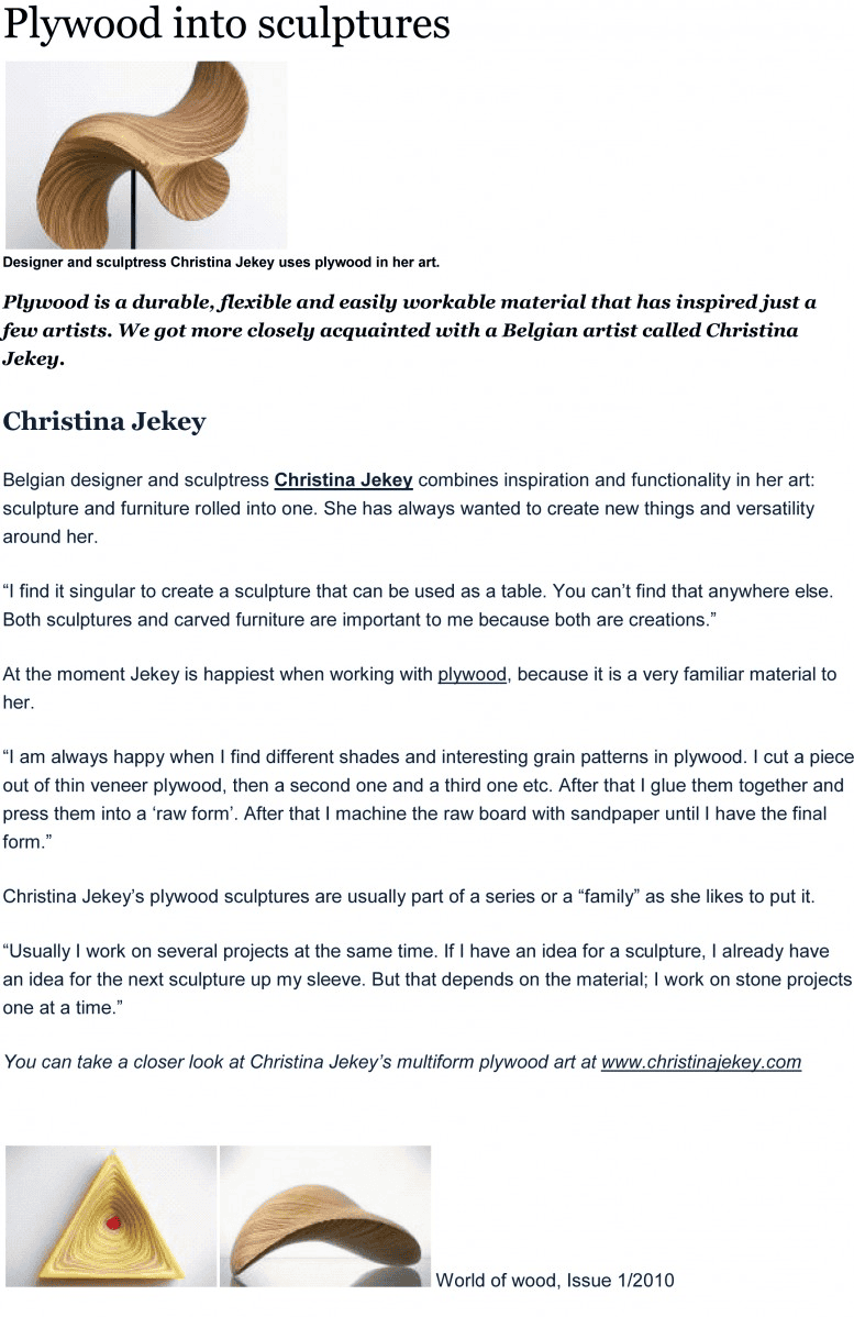 Les sculptures de Christina Jékey nous fascinent. Créées à partir d'un matériau banal, des plaques de triplex superposées, collées, poncées et polies, elles semblent façonnées en bois précieux, aux nuances multiples. Elles captent les stries d'un mouvement tout en spirales fluides. Cela ressemble à des vagues maîtrisées, sereines, qui forment une sorte de flux impeccable, une houle toujours naissante. Les béances, les ouvertures, les courbures s'additionnent, se conjuguent, s'interpellent. Posées sur socle ou déployées au sol, les formes pures, comme surgies d'un règne naturel, multiplient les angles de vue, au gré de la disposition choisie. Loin d'un art figé, Christina Jékey nous propose des commencements, des partances... Elle débusque toutes les possibilités du matériau d'origine et lui invente une nouvelle vie. Elle élabore une œuvre exigeante, méditative, à la recherche de sa propre cohérence, une œuvre qui interroge les lois de l'univers, et qui dans la lignée de certains grands sculpteurs contemporains, ose aussi, tout simplement, affirmer la beauté.
