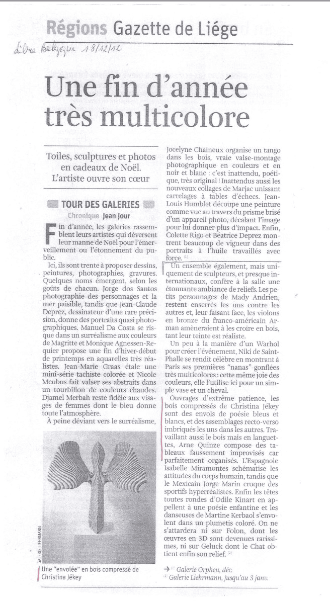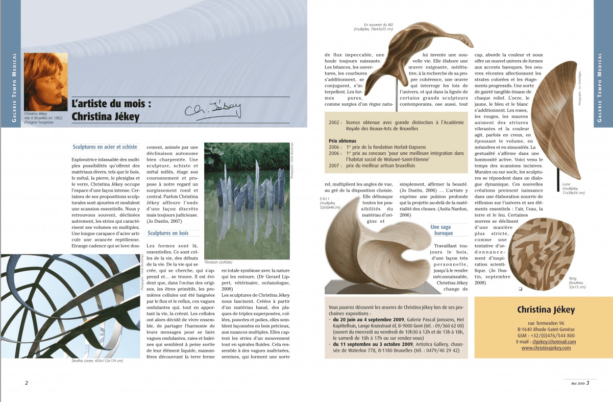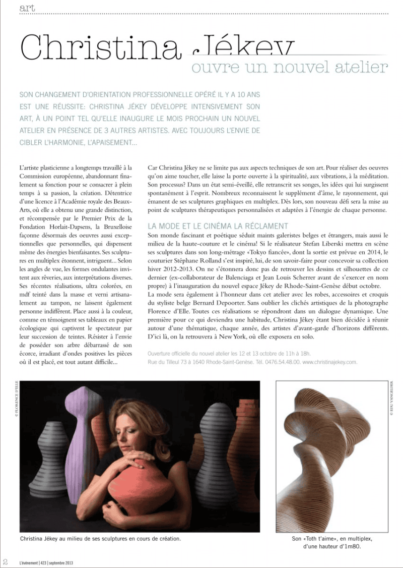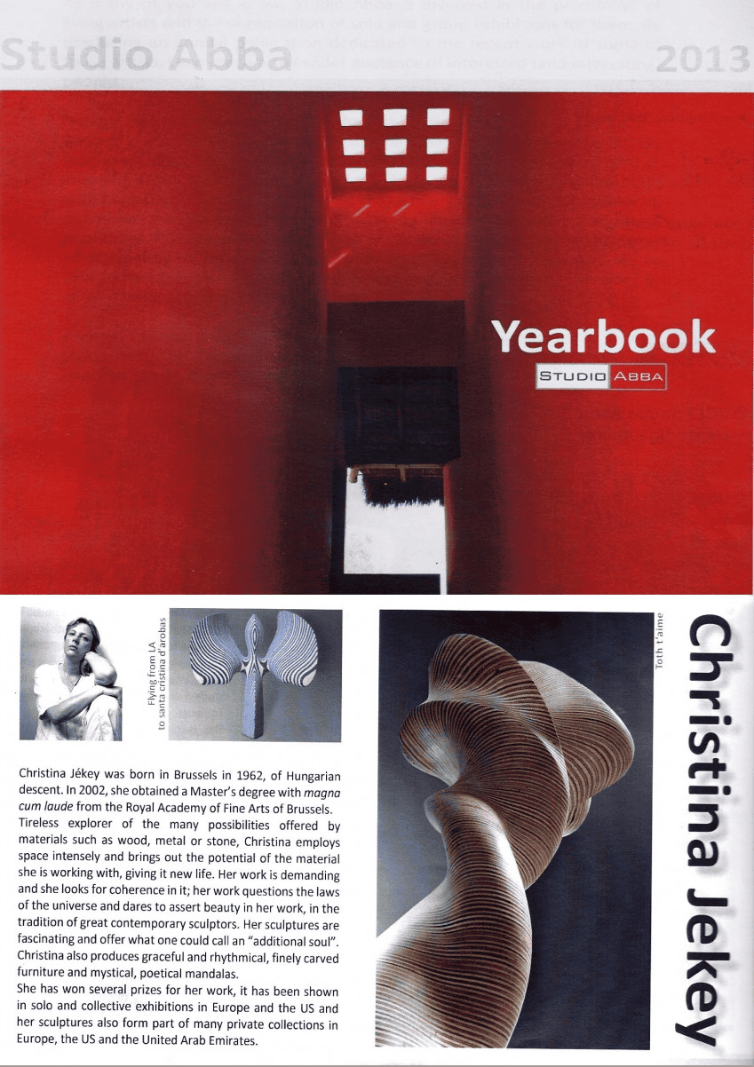 Les sculptures de Christina Jékey nous fascinent. Créées à partir d'un matériau banal, des plaques de triplex superposées, collées, poncées et polies, elles semblent façonnées en bois précieux, aux nuances multiples. Elles captent les stries d'un mouvement tout en spirales fluides. Cela ressemble à des vagues maîtrisées, sereines, qui forment une sorte de flux impeccable, une houle toujours naissante. Les béances, les ouvertures, les courbures s'additionnent, se conjuguent, s'interpellent. Posées sur socle ou déployées au sol, les formes pures, comme surgies d'un règne naturel, multiplient les angles de vue, au gré de la disposition choisie. Loin d'un art figé, Christina Jékey nous propose des commencements, des partances... Elle débusque toutes les possibilités du matériau d'origine et lui invente une nouvelle vie. Elle élabore une œuvre exigeante, méditative, à la recherche de sa propre cohérence, une œuvre qui interroge les lois de l'univers, et qui dans la lignée de certains grands sculpteurs contemporains, ose aussi, tout simplement, affirmer la beauté.